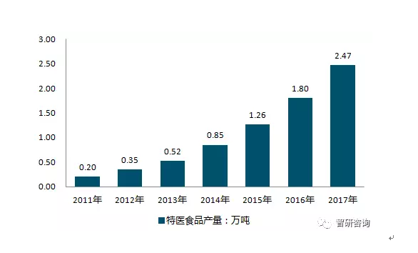 2011~2017 中國特醫(yī)食品行業(yè)產(chǎn)量情況▲