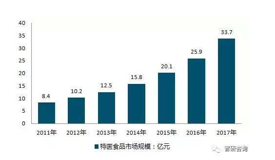 據(jù)智研咨詢,2017年中國特醫(yī)食品行業(yè)規(guī)模達(dá)到33.7億元,較2016年同期增長30.12%。